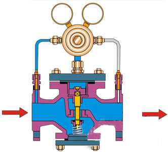 本系列减压阀属于先导活塞式减压阀。由主阀和导阀两部分组成。主阀主要由阀座、主阀盘、活塞、弹簧等零件组成。导阀主要由阀座、阀瓣、膜片、弹簧、调节弹簧等零件组成。通过调节调节弹簧压力设定出口压力、利用膜片传感出口压力变化,通过导阀启闭驱动活塞调节主阀节流部位过流面积的大小,实现减压稳压功能。本产品主要用于气体管路,如空气、氮气、氧气、氢气、液化气、天然气等气体。