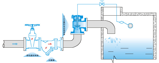 当水池或水塔内水位下降,浮球阀开启排水时,进水管内有压水将阀内活塞托起,密封面打开,阀门即开启供水,当水位上升到控制阀时,浮球阀关闭,活塞下移将密封面封闭,阀门即停止供水。