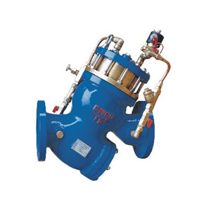 YQ98006型过滤活塞式电磁控制阀由主阀、电磁导阀、针阀、球阀、微形过滤器组成水力控制接管系统。通过电磁导阀可以实现对阀门开启和关闭的遥控。当阀门从进口端给水时,水流流过针阀进入主阀上腔控制室,当电磁导阀打开时,控制室内的水经电磁导阀、球阀流出。球阀开度大于针阀开度,主阀上腔控制室内压力变低,主阀处于全开状态。当电磁导阀关闭时,主阀上腔控制室的水不能流出,控制室升压,推动活塞关闭主阀。电磁控制阀利用导阀控制阀门的开启和关闭,反映准确快速,采用三向电磁阀,维护简单。安装于各类给水系统的管道上。