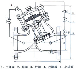 水力控制阀是利用系统自身的水压控制阀门的开关,它由一个主阀及其附设的导管﹑导阀﹑针阀﹑球阀和压力表等组成, 主阀安装在配水管路需控制流量和压力的管路中.保持预定流量不变,将过大流量限制在一个预定值将上游高压减为下游低压。 |