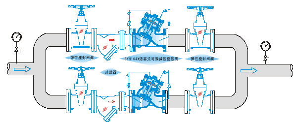 型号: YXH104X 口径: 50~1400mm 压力: 1.0~2.5MPa 材质: 铸铁、铸钢、不锈钢 活塞式可调式减压稳压阀是安装于高层建筑给排水系统管道上,将进口压力减至某一需要的出口压力的特种阀门。该阀门依靠本身能量使出口压力保持稳定在设定植,即出口压力不因进口压力及流量的变化而变化,并且阀门控制系统的进口处装有一个自清洁滤网,利用利用体特性,使比重较大、直径较大的悬浮颗粒不会进入控制系统,确保系统循环畅通无阻,使阀门能安全可靠地运行。系统动作平稳、强度高、使用寿命长。活塞式使用于大于450口径的阀门。